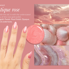 Rose gold. Pastel. Pearl finish. Opaque. Neutral undertone.