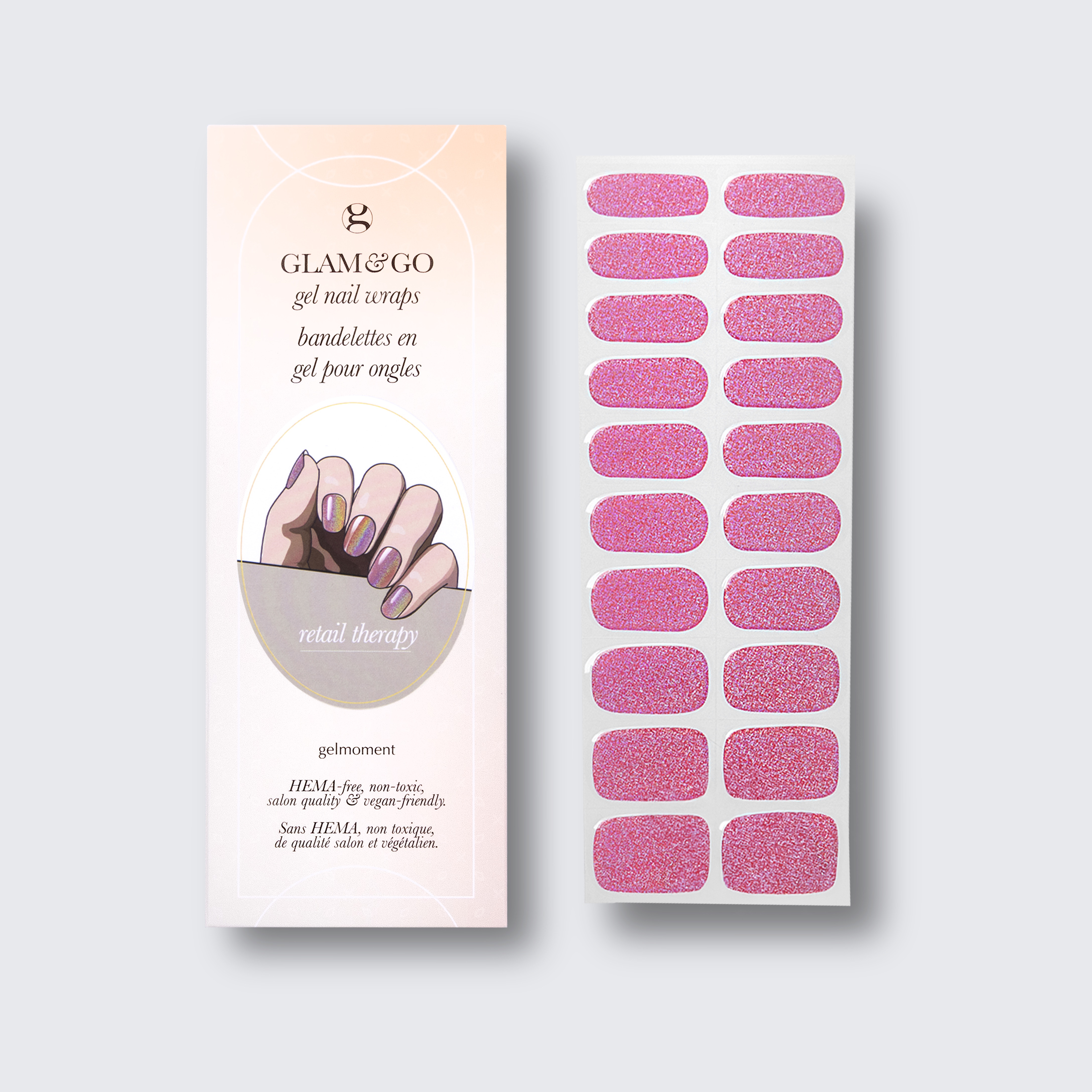 Plus, not only do GLAM & GO gel nail wraps provide the same glossy finish you know and love from our regular gel polish, but they are also HEMA FREE and have a wear time of up to 14+ days.