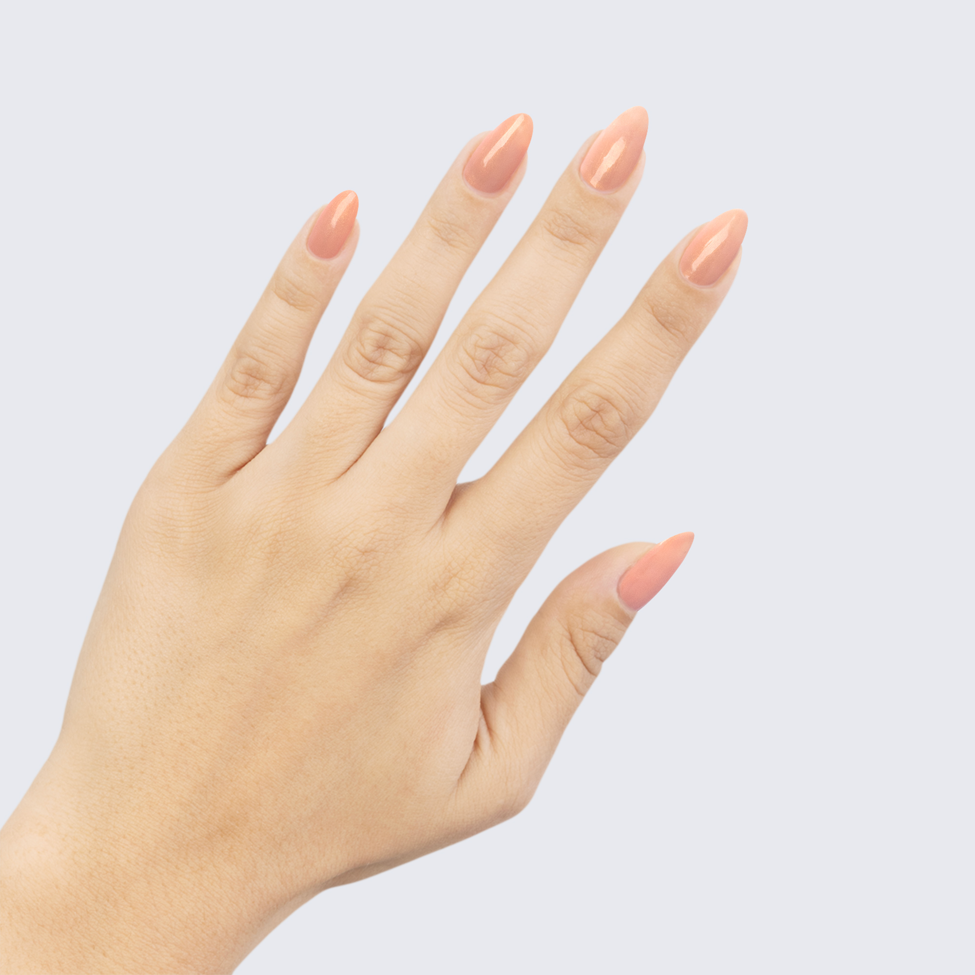 Pale muted peach. Pearl finish. Golden iridescence. Opaque. Warm undertone.